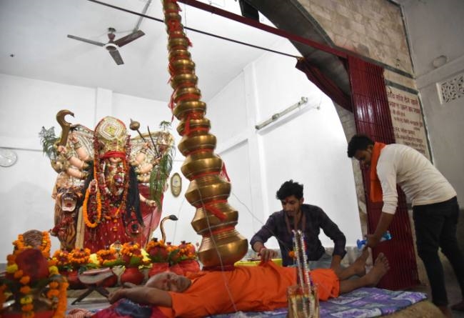 Bihar: A temple priest in Patna pay obeisance to goddess Durga by placing 21 water-filled kalashas on his chest